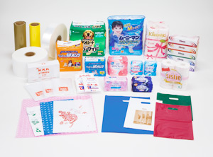 産業用資材紙おむつ・トイレットペーパー・キッチンタオルペーパー・ティッシュペーパーなどの外袋、土木建材用資材 環境対応型植物由来PE配合フィルム・再生PE使用ごみ袋 その他規格袋、肥料袋、食品包装、ファッションバッグ、鮮度保持袋(ポリフレッシュ)